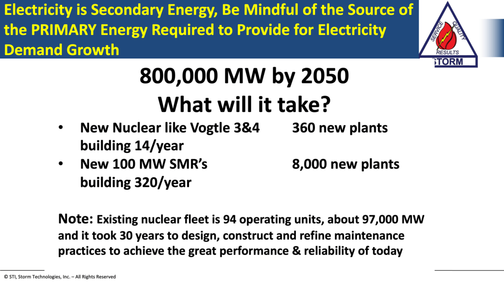 Think about the need of 100 GW of new power generation by 2030. If the growth in supply was all nuclear, 100 GW would be equivalent to completing 45 new nuclear units the size of Vogtle units #3 & 4 in four years, if started today.