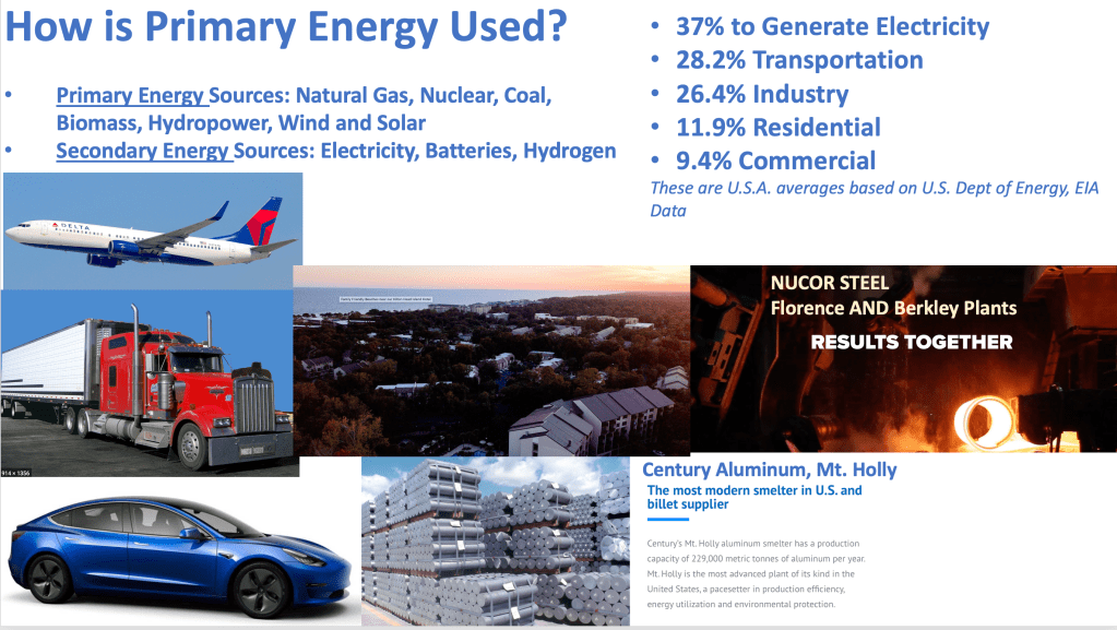 I show these data on world population and current energy use to emphasize why I believe a portfolio of all fuels are important. The figure below is a reminder of the importance of energy to power high quality of living and the uses of energy in the U.S.A. Please keep in mind, Electricity is very important and I worked my entire career helping to produce the least cost, most efficient and most reliables electricity that I could. Transportation, Industrial output, residential heating, cooling and cooking and commercial buildings together comprise nearly twice as much energy consumption as electricity generation. Electric vehicles like the Tesla electric vehicle shown in the lower left below may change the use of primary energy by 2040 or before.