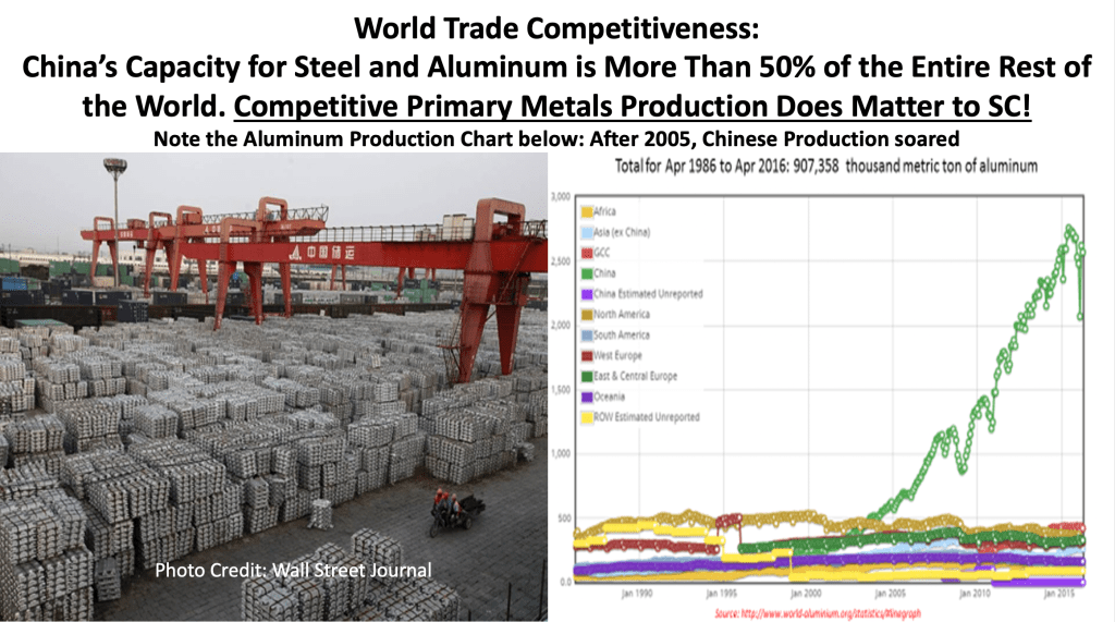 I used the figure above in a recent presentation to our Hilton Head Rotary Club to discuss the “Importance of Reasonable Cost, Reliable Energy and Electricity to South Carolina”. In SC about one third of our electricity is used for the production of primary metals. Namely, steel and aluminum. The NUCOR Steel and Century Aluminum plants are amongst the state’s largest employers. The steel and aluminum is important for American manufacturing. Reasonable cost, clean energy is required for America’s steel and aluminum manufacturers to compete with China. In previous posts I have shown China’s rise in manufacturing since 2001 where they now produce over 50% of the entire world production of steel and aluminum. It is important that America keeps production of primary metals within our borders not only to provide jobs and a thriving economy but also for National Security. Yes, in America, we have proven that when we work together, we can have it all! Economic prosperity, Made in U.S.A. products and clean air and clean water too!