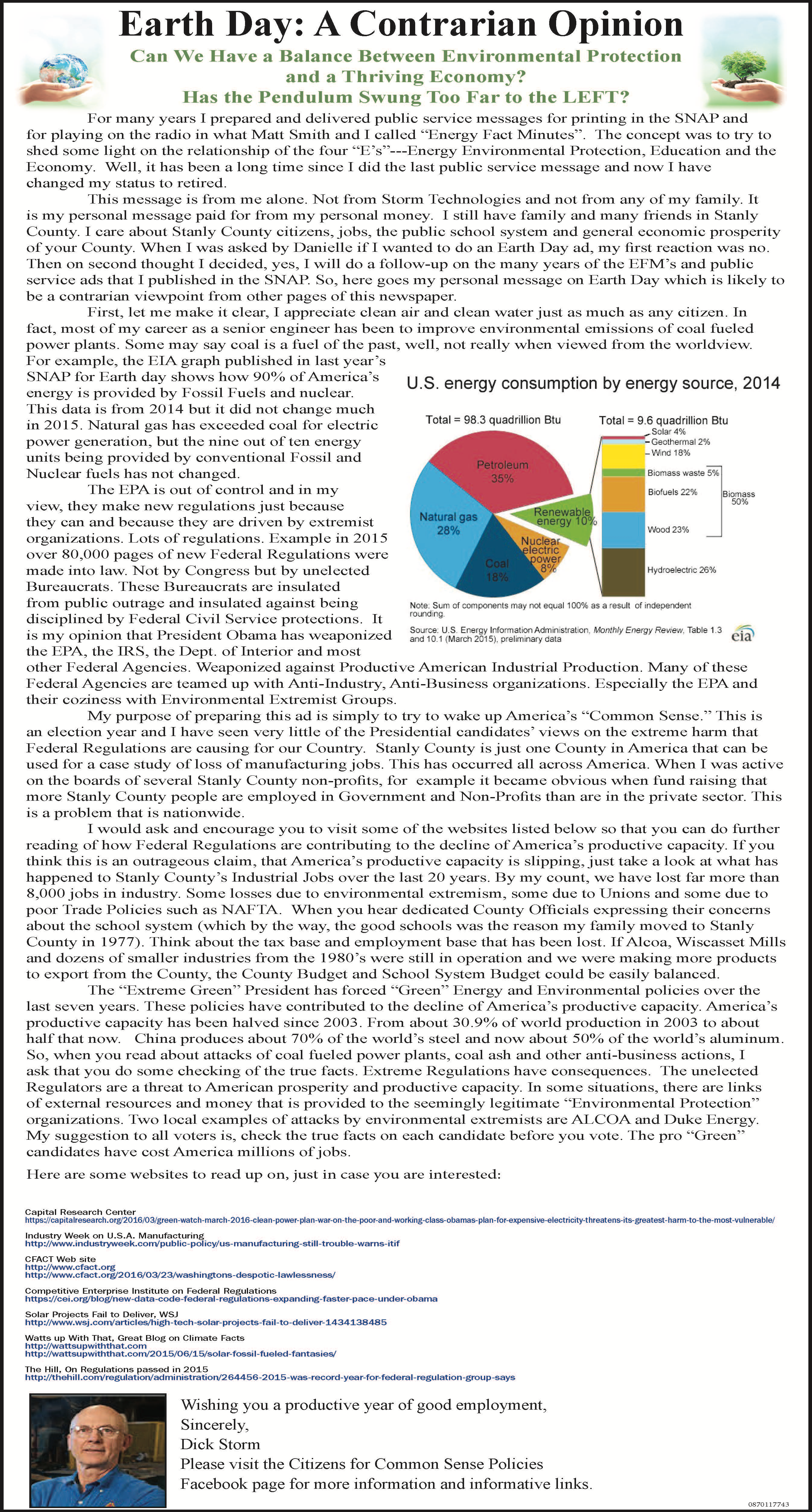I enjoyed a long career working in the electric power and primary metals industries over 50+ years. I traveled the world and have seen with my own two eyes the difference that energy can make to improve lives. Many of the Blessings we Americans take for granted, such as clean water, clean air, easy mobility to travel, food stores with full shelves of safe, fresh food are not enjoyed by billions of people on the planet. If you can imagine it, nearly a billion souls do not have access to electricity and refrigeration. So, here are my thoughts on energy and Earth Day. Computers are marvelous, this one allowed me to dig back to an Earth Day Ad I placed in the “Stanly News and Press” back in 2015. Things have not changed much since then. My six year old ad is below, published during the Obama Administration: