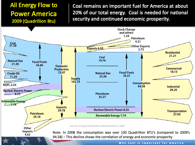I have used the U.S. Department of Energy Sankey Diagram of “Total Primary Energy” for many years and have discussed the fact that America typically requires 100 Quadrillion Btus of energy each year to power our high quality of life. Here below is the Sankey Diagram showing the Total Primary Energy used in 2008. Note it is 102.75 Quadrillion Btus. What has changed as the years (and War on Coal) have gone by, is the source of the fuels. In 2008 coal was 19.76 Quadrillion Btus. In 2021 coal was about half that at 10.5 Quadrillion Btus as natural gas fuel was more widely used for power generation 2008 to 2021. However, the total primary energy for normal economic activity remains right at 100 Quadrillion Btus. In 2019 before Covid, it was 101 Quads.