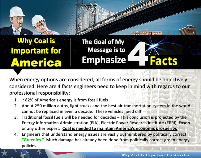 During last Thanksgiving week I was thinking of the many Blessings I have had over my life-time and it occurred to me that not only me but all other Americans are Blessed with an enormous treasure of energy (and many minerals we need too) right within our borders. It has been said before, “America is the Saudi Arabia of Coal”. What follows are some slide excerpts from my 2011 talk to the American Society of Mechanical Engineers (ASME) where my main point was, “Coal is Important”. It was then and remains important in 2022.