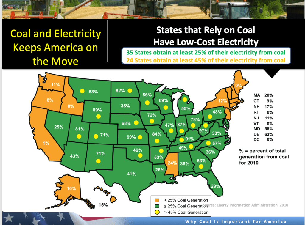 I presented my views on the importance of coal to the ASME Annual Meeting in Dallas at the Plenary Session in the summer of 2011. Back then, over 50% of America’s electricity was generated by coal power and hundreds of new coal plants were in the planning stages to modernize the coal fleet. Electricity costs in the U.S. were amongst the lowest in the world. The map with electricity costs is from 2010 data and from Dick Storm presentation to the ASME Annual Meeting.