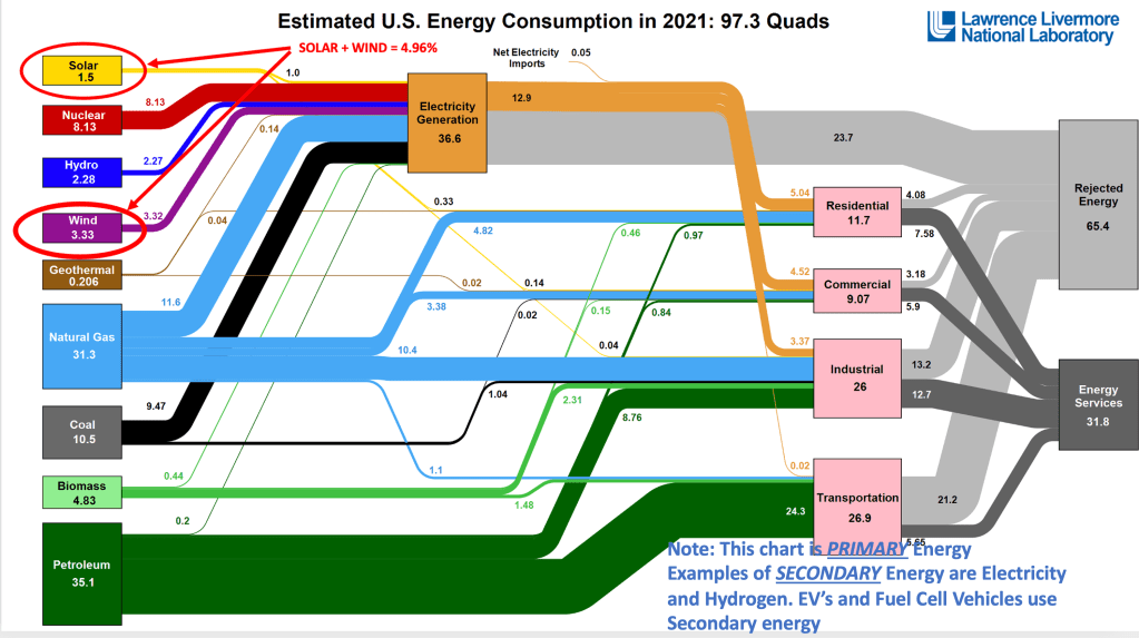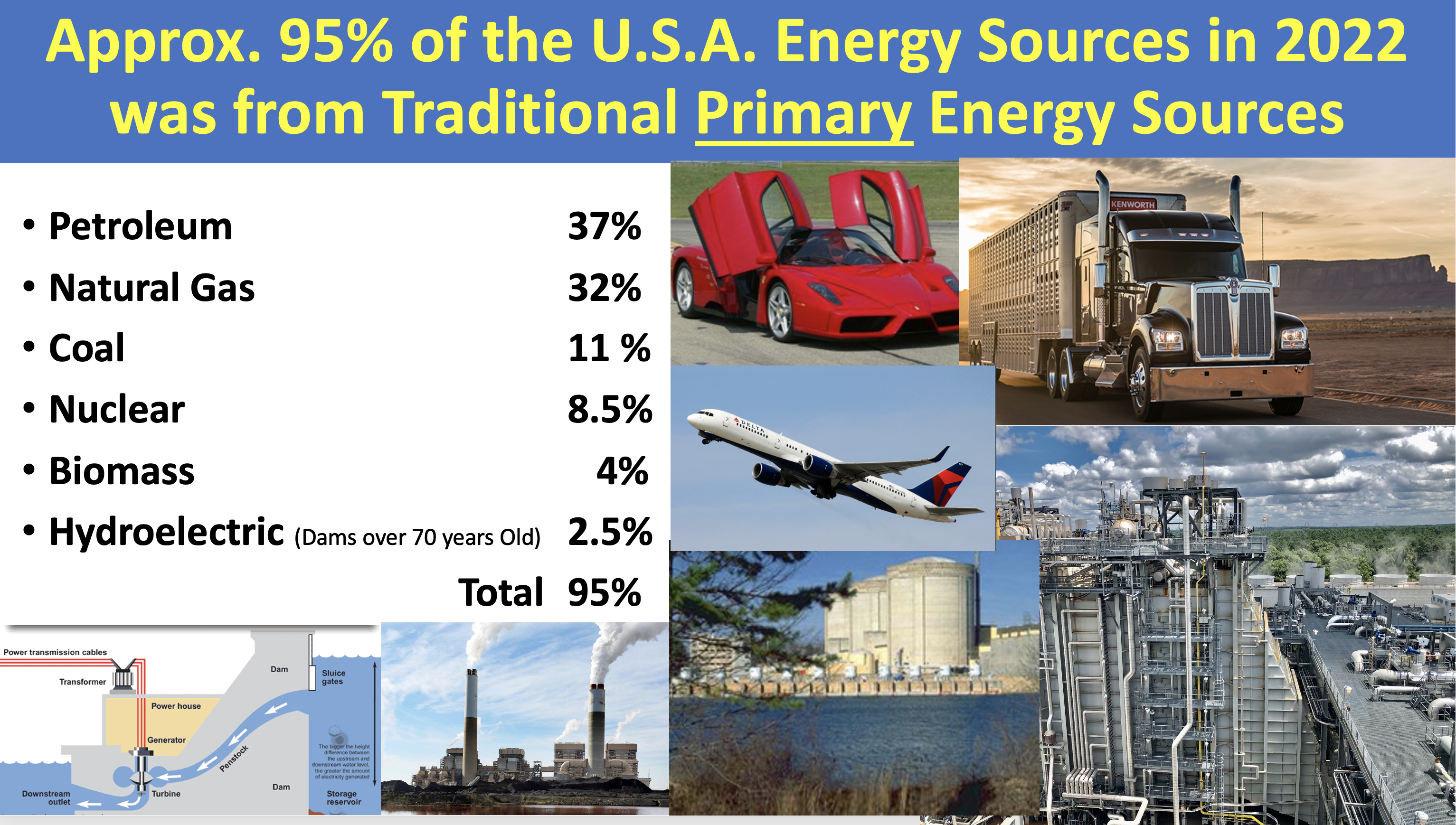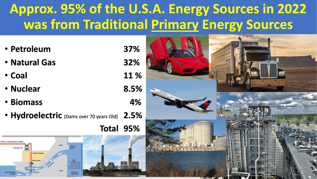 Since the Oil Embargoes of the 1970 and 1980’s the public has been indoctrinated by extremists. Part of the indoctrination was well meaning to force government action on cleaning the air and water of our great country. This goal, has been largely accomplished. However, the extremists have grown in influence to seek more than clean air and clean water, they have morphed into promoters of Socialism and one world government. My previous posts on my Blog have described my thoughts on the demonization of carbon and the war on coal, and how they came to be. This post was primarily written to show my attempt through a two part course on energy and electricity generation to provide an energy information course for the general public. The course was provided as part of the USCB-OLLI program and entitled, “Understanding Net Zero Carbon”. It is posted on LinkedIn. Part 1 and Part 2. Then, as I thought about the misguided indoctrination of the public, I thought it would be helpful to provide some insight as to how such absurd energy policies came to be. Therefore, at the end of this post is a summary of some of how this public indoctrination into “Electrifying Everything with Wind and Solar” evolved. It began as misguided public indoctrination. Now it is the “Green New Deal” passed into law and codified into government policy as part of the so-called “Inflation Reduction Act”. The green policy is based on the premis that, “Everything can be Electrified”. Really? The illustration below shows the traditional sources of 95% of our primary energy. A large part of the public’s misunderstanding about energy is NOT knowing the difference between Primary and Secondary Energy. Many Energy providers do not help with clearing up the public’s confusion. I will provide an example later.