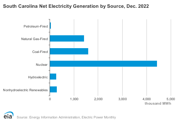 The EIA chart of nuclear generated electricity for the state of S.C. is shown below. Over 54% of S.C. electricity was generated from four nuclear stations within the state in 2022. These plants are very reliable, robust and safe. Most are also very old. Two, Oconee and Robinson began operations in the 1970’s. I know that for a fact, because I was working for Babcock & Wilcox in Barberton, Ohio in 1966 when the Reactors and Steam Generators for Oconee were being manufactured. These outstandingly successful units may receive new operating licenses for another 30 years, but the fact remains, some day new generation will be required to replace the aging units.