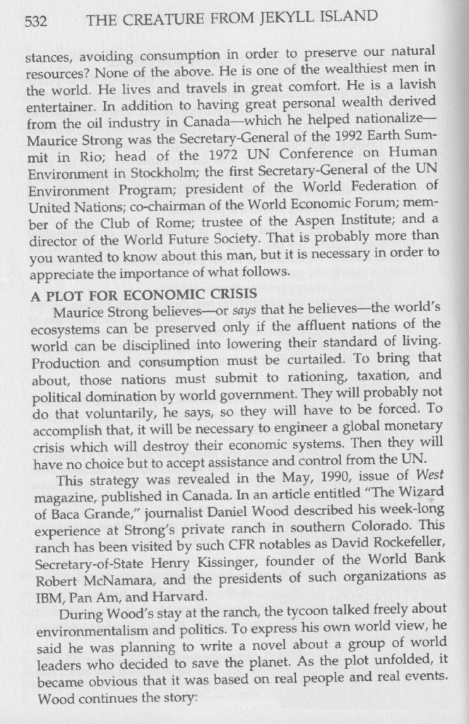 Last week I finished reading an interesting book on the history of the Federal Reserve. Not expecting to find information on energy or climate policy, one chapter turned out to be quite informative on the world-wide environmental movement. The meticulously researched book is entitled, “The Creature from Jekyll Island” by Edward Griffin. (341) Here are some excerpts from chapter 24, “Doomsday Mechanisms”. here is a scan of pages 531 & 532.