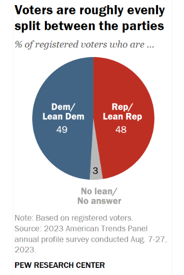 The inspiration to write this commentary was the News Media reporting of various polls of “If the election were held today, who would you vote for?”. President Trump and Biden are right at 50-50. In my view, if the status of the truly important concerns in America were compared to when Trump left office in 2020, and if all of the factors that keep America strong were considered, then the polls should be about 99% for Trump. The Pew poll graphic from 2023 is shown below. It hasn’t changed much. Trump and Biden are still within a few points of the same support.