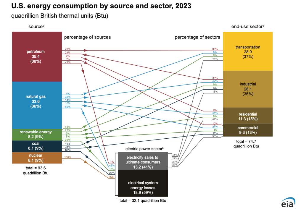 The most common Internal Combustion Engines (ICE’s) of course are used in transportation. Automobiles, trucks, tractors, farm equipment, construction equipment, aircraft, ships and trains. According to the U.S. Department of Energy, about 37% of the total Primary Energy used in the U.S. during 2023 was for transportation. About 28 Quadrillion BTUs to be exact.