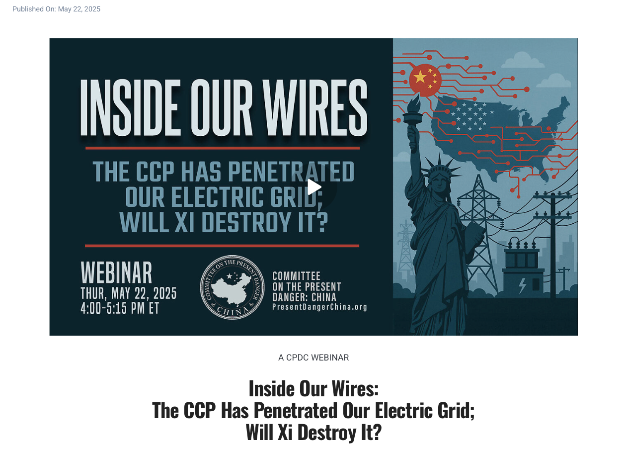 1. “Inside Our Wires: The CCP Has Penetrated Our Electric Grid, Will Xi Destroy It?” https://presentdangerchina.org/webinar-inside-our-wires-the-ccp-has-penetrated-our-electric-grid-will-xi-destroy-it/