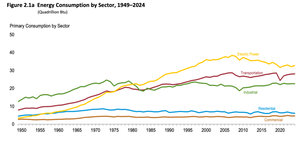 Here is a chart of the five sectors of Primary energy use, since 1950. The five sectors being: Electricity generation, Transportation, Industrial, Residential and Commercial.