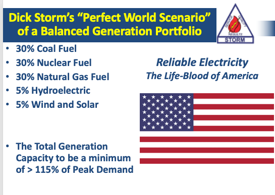 The best choice for a Balanced Portfolio then, in my analysis is to build new coal plants. In Dick Storm’s Perfect World of Power Generation, I would like to see a Balanced generation portfolio of 30% coal, nuclear, gas, with 10% renewables. Illustration from the Coal Institute presentation.