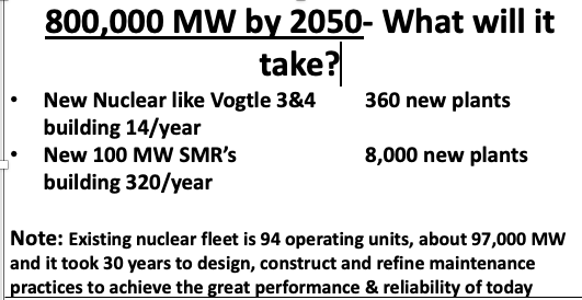 The term BULK POWER means just that, Bulk Power in hundreds and thousands of Megawatts. America needs huge Bulk Power generation additions of about 30,000 MW per year, not small scale R&D projects of variable generation or unproven new SMRs. Perhaps some time in the future renewables and new nuclear will be viable and competitive. However for now, we need 100-800 GW of new electricity generation to replace the more than 200 GW of reliable coal plants that were either shut down or planned for shut down soon. Satisfying the growing electricity demand of the future requires lots (Lots= 30,000 MW each year) of new generation capable of 24/7 generation.