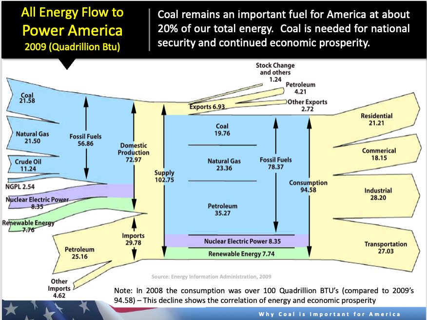The chart above is from 2022. The one below from 2009. I used this chart in a presentation to the ASME in 2011 to attempt to impress the members with the importance of coal. At the time, America was using coal for about 45% of our electricity generation and the primary energy used to generate that power was about 20 Quadrillion BTUs of coal fuel. As can be seen from the two charts, natural gas increased about 10 Quads and coal decreased a similar amount. Basically, substituting natural gas for coal power production.