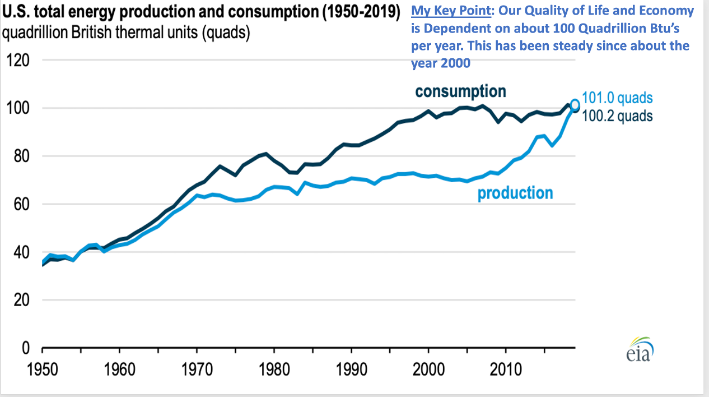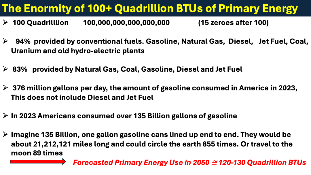 The public in general, has a very weak understanding of the generation of electricity and how it is managed. Therefore, I thought I would describe in understandable terms; primary energy, electricity and the enormity of 100 Quadrillion BTUs. Perhaps this will reach people and politicians that are otherwise unaware of the magnitude of the primary energy supplied by conventional forms of energy which we absolutely need to power our lives.