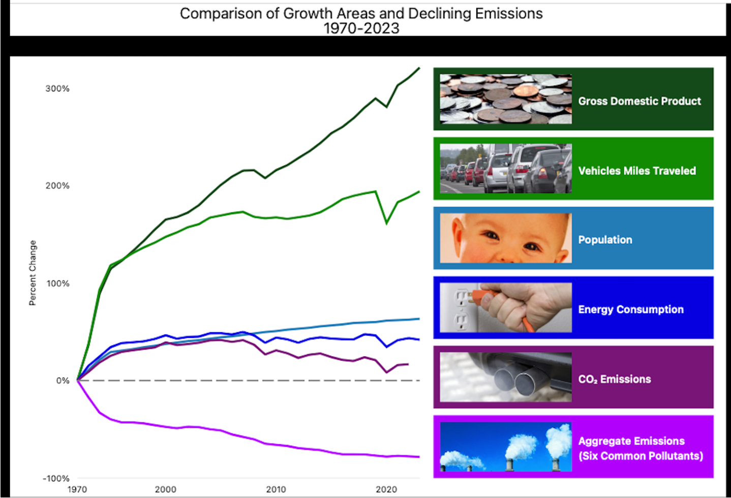 - Modern Coal Plants are clean and the emissions of major pollutants have been corrected with backend pollution control equipment. The six main pollutants have been reduced since 1970 in spite of increases in GDP, Population, auto miles driven and greater use of energy in all forms. The EPA chart below shows the progress achieved.