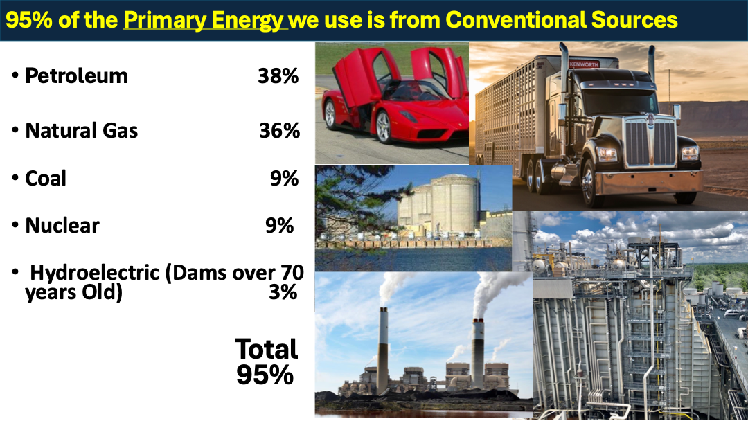 Conventional forms of energy, that is those forms of energy we have depended on for the last hundred years, still provide well over 90% of the Primary energy that we need for our economy to thrive and to power our lives.