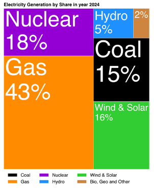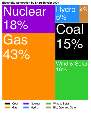 Thermal electric power generation dominates U.S. electricity generation. Gas fuel has taken the lead from coal since about 2010. The total Thermal power generation in the U.S. in 2024 was about 76% Thermal generation.