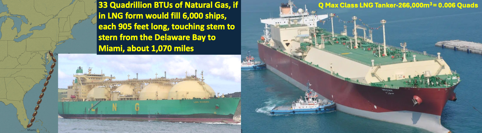 About 43% of America’s electricity was generated from pipeline supplied natural gas in 2025. It is hard to visualize 33 Quadrillion BTUs of methane, so I thought showing huge LNG tanker ships might be a way to describe the challenge of increasing America’s total Primary energy consumption from the current @ 100 Quads to the range of 120 Quads by 2050.