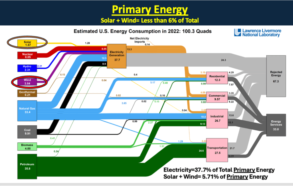 This includes all forms of energy including oil, gas, coal, nuclear and renewables. As more AI Data Centers are built, more manufacturing is reshored, more EVs placed on the highways and greater electrification is transitioned across the economy, the demand for total primary energy is expected to increase. Coal is the most practical, achievable and available addition to provide 10-30 quadrillion BTUs more per annum of growing primary energy supply. Do you remember the phrase from a couple years ago, “Electrify Everything”? Let’s get back to the basics of Primary energy and then look at the incredibly huge contribution of conventional fuels. Also, the diminutive contribution of wind and solar.