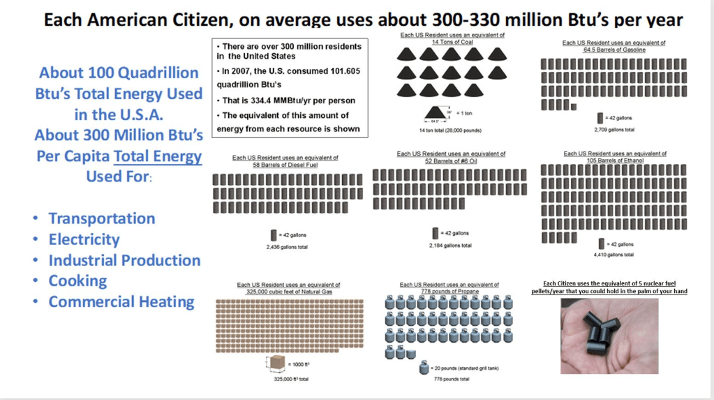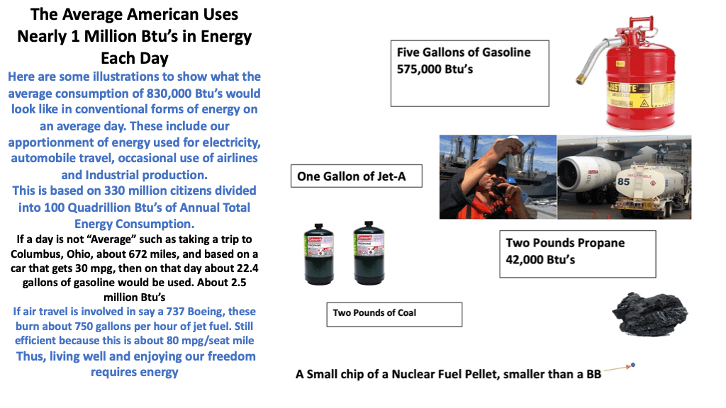 Americans use between 833,000 and 1,000,000 BTUs of energy each day to sustain our quality of life. There are some misguided leaders and politicians that are on a path to destroy the magnificent prime movers that power our lives.