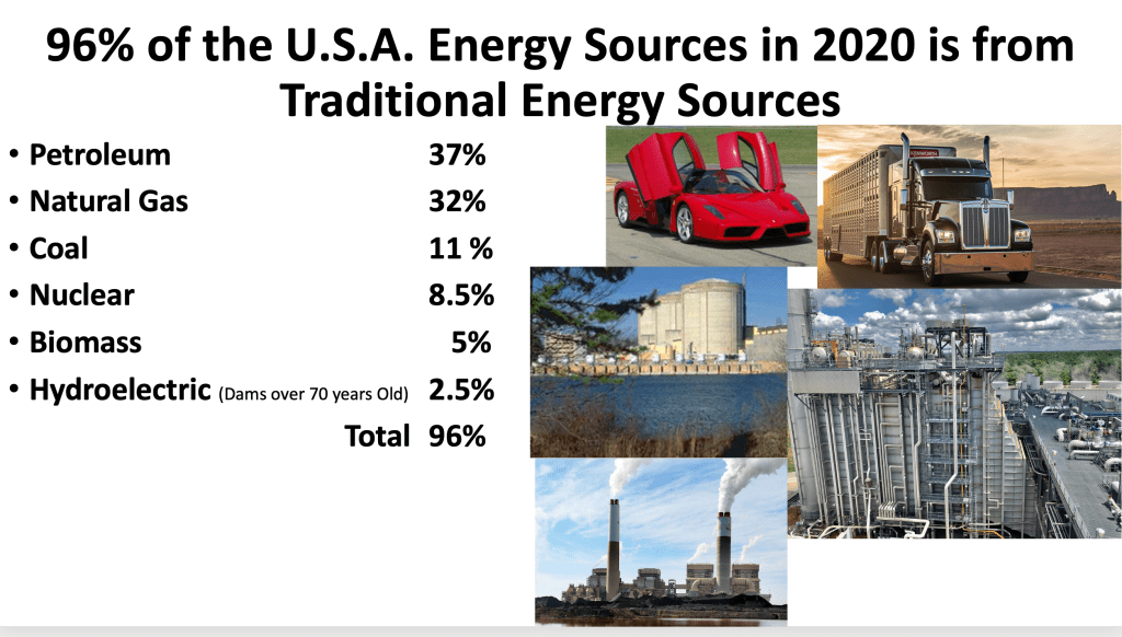 I have written on this before and had some feedback from readers and friends that “The general public doesn’t understand it when they are told they use about 850,000 BTUs of energy each day or the U.S. used 100 Quadrillion BTUs in a year”. Therefore, for this two part essay I thought I would express electricity energy in “Horsepower”. Rather than BTUs, kWH, Joules or Foot-Pounds, this article expresses energy production in Horsepower because, especially my family and friends, horsepower is a term most folks look at when buying a new car or truck, whether it is a 250 Hp Diesel fueled Ford F-150 or a 1020 Hp Tesla Model S. The fuel for each must first be provided by Primary Energy used to create either motive force or electricity.