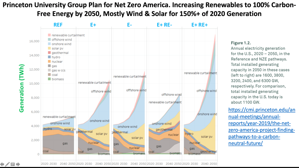 Let’s get to electricity. The total energy used in 2019 was 100 Quadrillion Btu’s and 37% of this was used to generate electricity. So if we look into the future of EV’s and eliminating the internal combustion engine, then the energy used for transportation will need to come from electricity. Lots more electricity. How does the “Net Zero 2050” proponents think they will get to zero carbon emissions? By windmills and solar. Lots of windmills and solar. Here is an illustration from the Princeton University Net Zero Path.