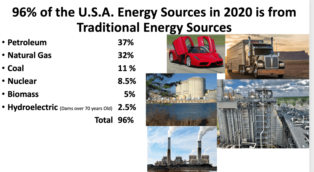 Congress and our President are in the process of forcing Net Zero Carbon, Green Energy on all of us. In my view what this will do is increase prices of energy, make our energy less reliable, make America less competitive and in general, harm our quality of life. In thinking about this and attempting to explain why I feel this way, it occurred to me that if all of the citizens knew where our energy comes from and how much we depend on it each day, perhaps more of us would pressure our Congressmen/Congreswomen to resist this foolishness. So, here is my stab at explaining where our energy comes from and why the “Green New Deal” is so harmful.