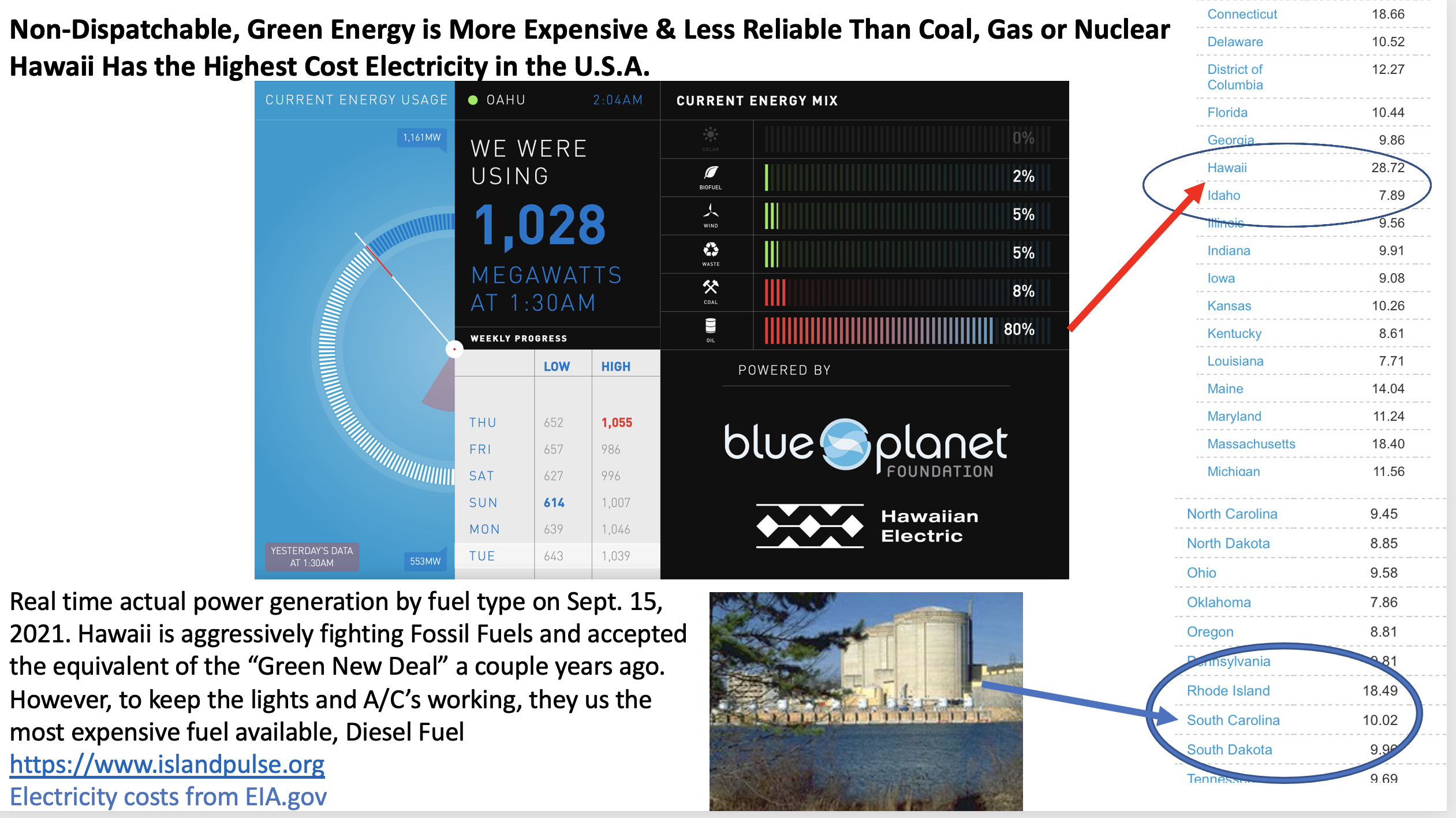 Are these examples of what “we the people” desire for all of America? How can we reshore American Manufacturing with electricity costs such as Hawaii now has? How can we remain the #1 Economy in the world if we depend on imported energy. Does anyone remember the 1974 Arab Oil Embargo and what it did to slow our way of life? Reminder, 96% of our energy is provided from conventional (including old nuclear plants) sources. Yes, old nuclear is good. My state of SC generates 55.8% of our electricity from nuclear plants, some of which are over 50 years old.
