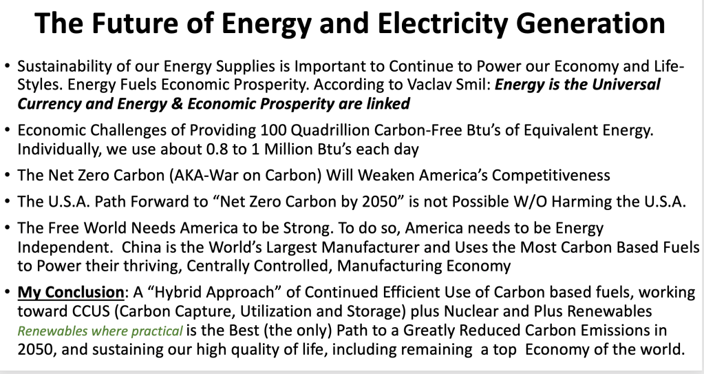 I presented a short course to the local University, OLLI, Life-Long Learning Program. I thought it may be helpful to provide a summary of the course on this Blog so that it is available to others. Mindful that many policy makers and voters are not aware of the costs of renewable energy and the difficulties in living without carbon based fuels. This course was intended to provide insight to non-energy engineers on this important topic. Also included at the end are numerous references that are not widely discussed by the Main Stream Media, Entertainment and even in “Woke” Social Media.