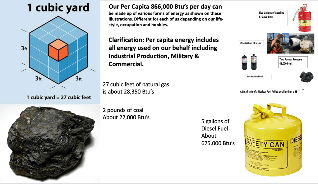 Each citizen uses almost a million Btu’s per day. Depending on employment type, home location in warmer or northern climate and life-styles, the amount of energy used will vary. But for me and my friends and our life-styles, I am sure we use over a million Btu’s per day. For the class, I prepared an illustration of just how an average person could use 866,000 to a million Btu’s each day.