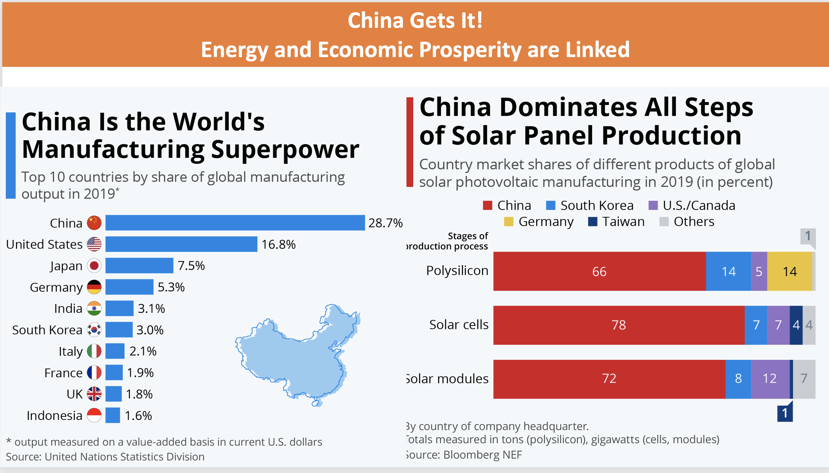 We stopped building large coal plants about 2014. With that comes a withering and loss of our productive manufacturing capacity. Recently, our Supply-Chain woes have been in the news. My friends ask me, How could we invent computer chips and then lose the capability to produce them here in the U.S.? How about steel tubing, steel shapes, aluminum, Rare Earth minerals and EV components? Pharmaceuticals? Where do most of these come from now? Most, come from China. China is the World’s largest manufacturer, so it seems reasonable to accept the published data that shows China using more energy than any other country.
