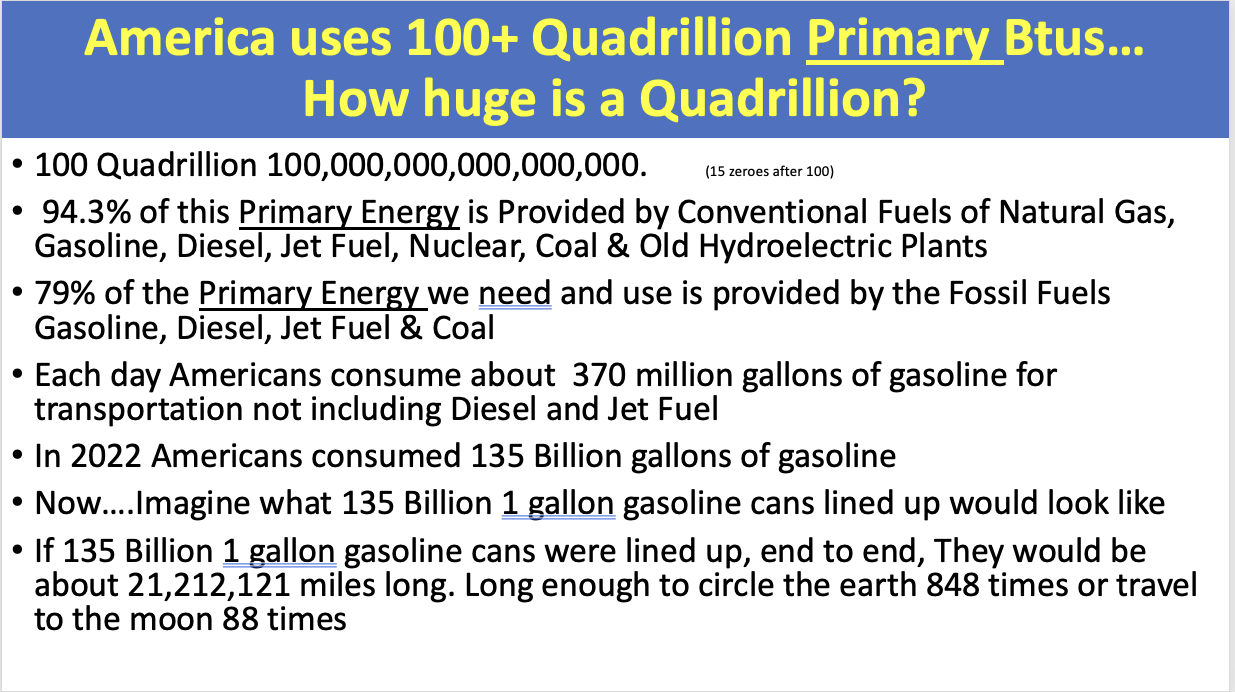 - America uses about 100 Quadrillion BTUs annually: https://dickstormprobizblog.org/2023/05/16/back-to-basics-the-u-s-needs-100-quadrillion-btus-year-of-primary-energy/