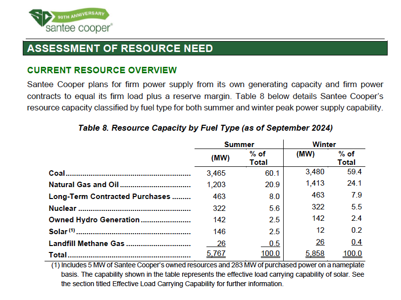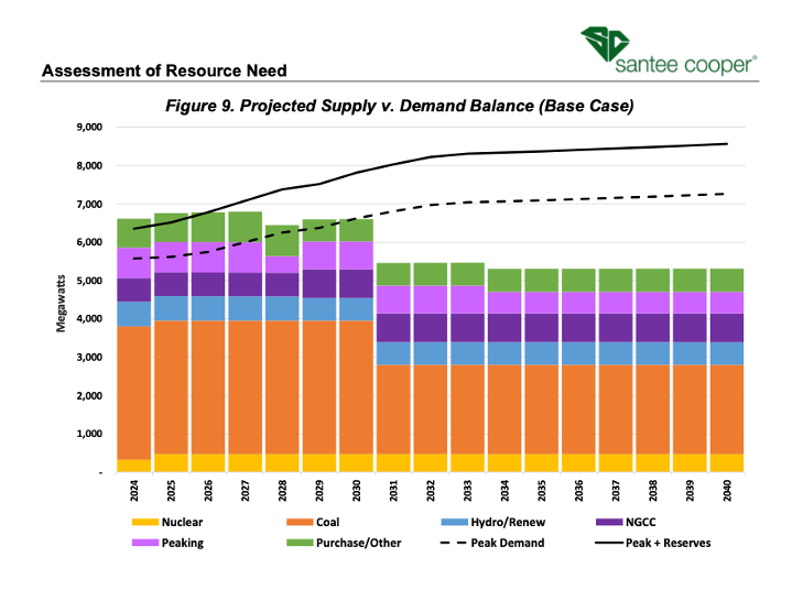 The Supply/Demand Chart of Santee-Cooper is shown below. Note the plan to reduce coal power generation and replace it with gas, purchased power and variable renewables.