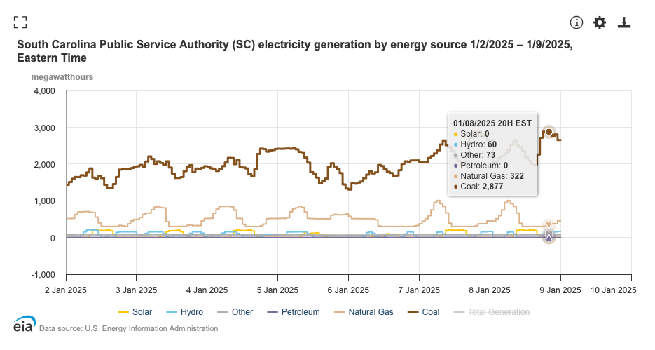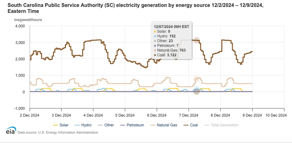 Like TVA, Santee-Cooper began with hydroelectric generation and as with TVA, the electricity demand rapidly increased to loads far in excess of the available hydroelectric capacity. Thus coal plants were built and for most of the last 80 years most of the electricity generation has been from coal fuel. This continues to be the case. The screenshot below is the electricity generation the week of December 2, 2024. The primary energy provided for the power production was 77% coal fuel at this time and it will be needed again this coming winter.