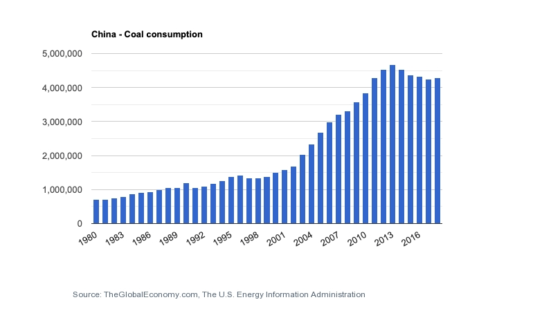 China’s coal consumption 1980-2018. China uses as much coal as all of the rest of the world each year