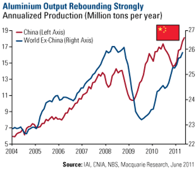 A comparison of Aluminum Production in China compared to the rest of the world. up to 2011. Chart from the Wall Street Journal.
