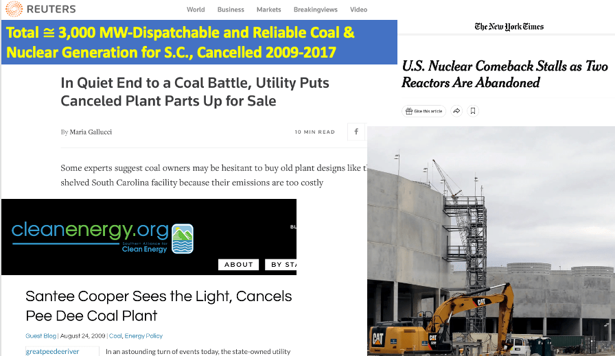 The Pee Dee Energy Center is one example of dozens of new, clean, efficient coal plants that were planned but cancelled due to political pressure of the environmental activists. I predict that these plants will be sorely missed during the winter peak power generation periods in December 2023 and January 2024. So will the Summer Nuclear Units #2 & 3 be missed.