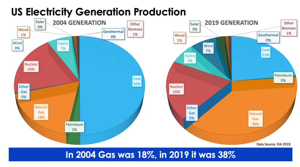 The combinations of low fuel cost, low Capital cost, low environmental emissions controls cost and greatly increased efficiency together made natural gas fuel more economically attractive than coal for new generating plants. The fuel of choice became natural gas for Utilities that had pipelines and sources of natural gas fuel. Coal fuel accounted for 50% of electricity generation in 2004 but was reduced to 23% by the increased use of more economical natural gas by 2019.