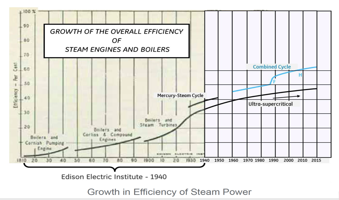 Natural gas generation has progressed from the first simple cycle unit built by G-E in 1949 at about 25% efficiency to today’s combined cycle gas turbine plants that at optimum load points can operate at over 60% thermal efficiency. They are amongst the most efficient machines ever built, of any kind.