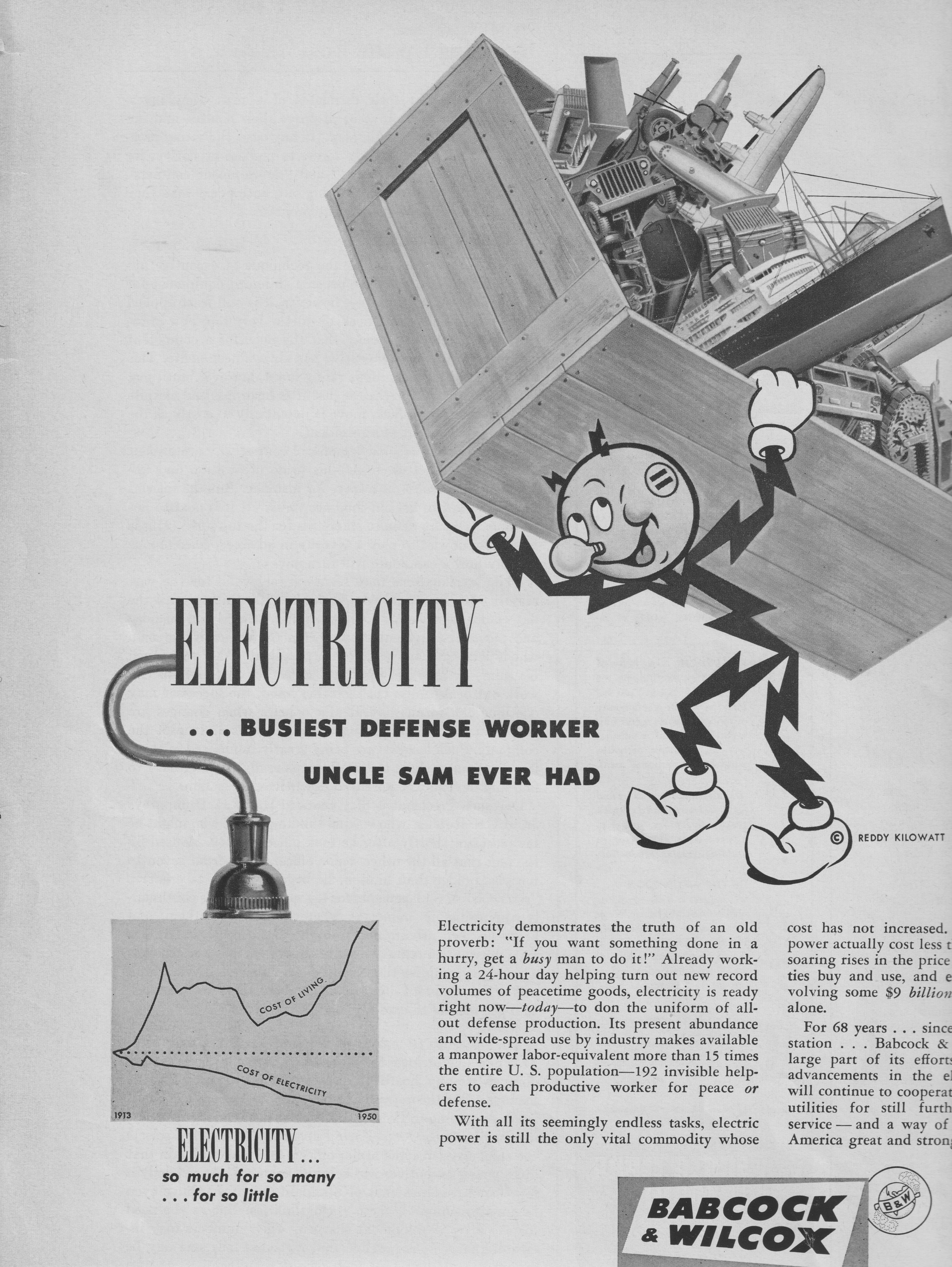 Reddy Kilowatt was used to teach the basics of “Living Better Electrically”. It was also part of a magazine advertising campaign in 1950. Here is an ad by B&W which manufactured about 40% of the steam generators used by the electric utilities and the U.S. Navy. B&W has a long history of steam generator manufacturing in the U.S. since 1867, providing steam generators to Thomas Edison and George Westinghouse and then growing to be a Fortune 500 company in the 1950’s and 1960’s.