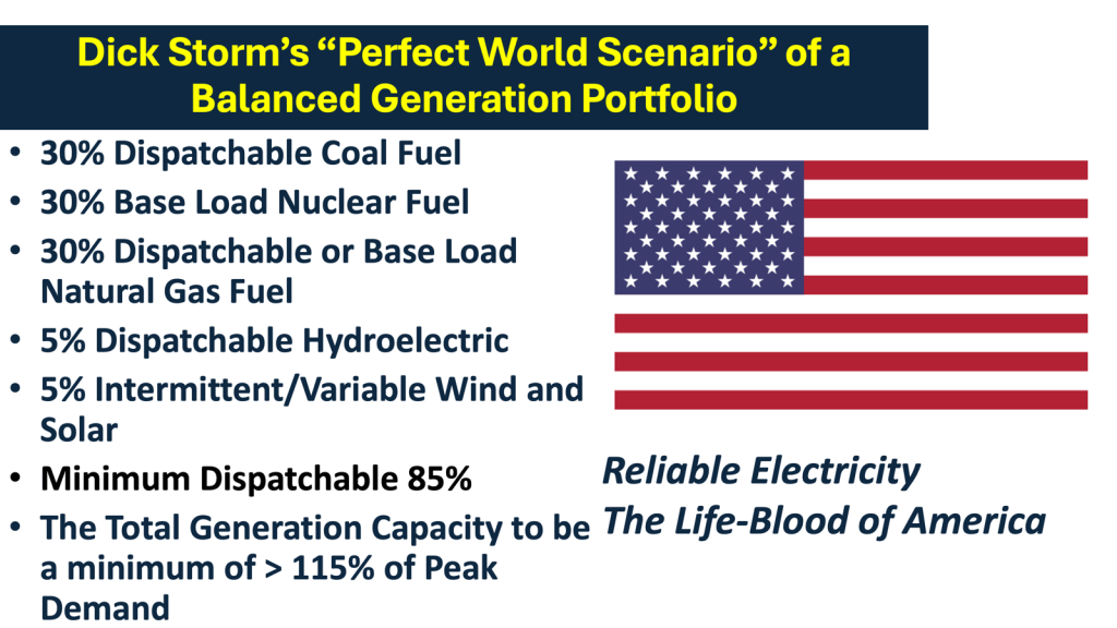 I advocate for coal because that is the fuel that I know and understand, having worked for five decades in the design, construction, startup, testing, operations, maintenance, upgrade modifications, tuning for efficiency and applying low NOx solutions to coal plants. I also advocate for natural gas and nuclear power because I believe a Balanced generation portfolio is best for the U.S.A. and each fuel has its advantages. Here is a slide from a recent presentation showing my preferred Bulk Power Generation portfolio.