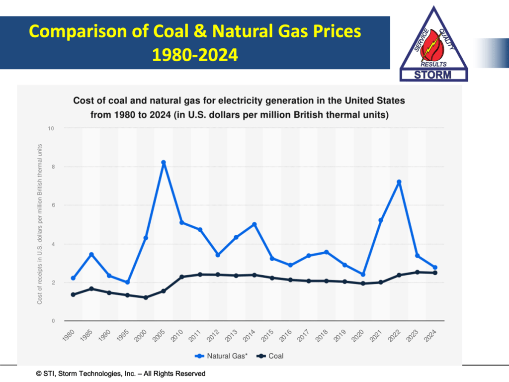 If this was winter and the world demand for LNG soared, then U.S. natural gas prices would (LNG Demand will likely exceed supply in the winter) escalate to peaks of over $10/million BTU. Fortunately, April is a low electricity demand season. Winter will come and I predict much higher than expected natural gas prices due to the world demand for LNG. Just as a reminder, the graph below shows natural gas spot market prices compared to coal prices, from 1980 to 2024.