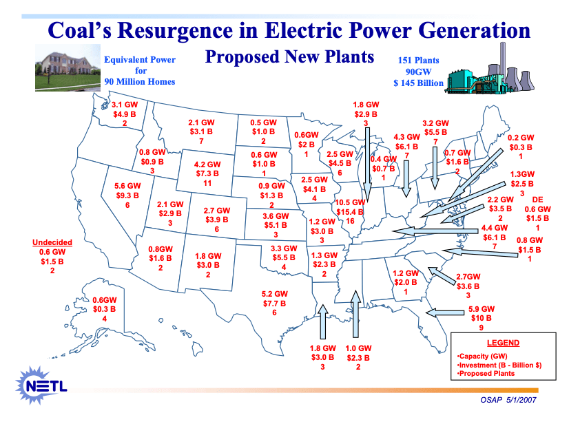 Two of the NETL slides from a 2007 presentation on Tracking of New Coal Plants are copied below.
