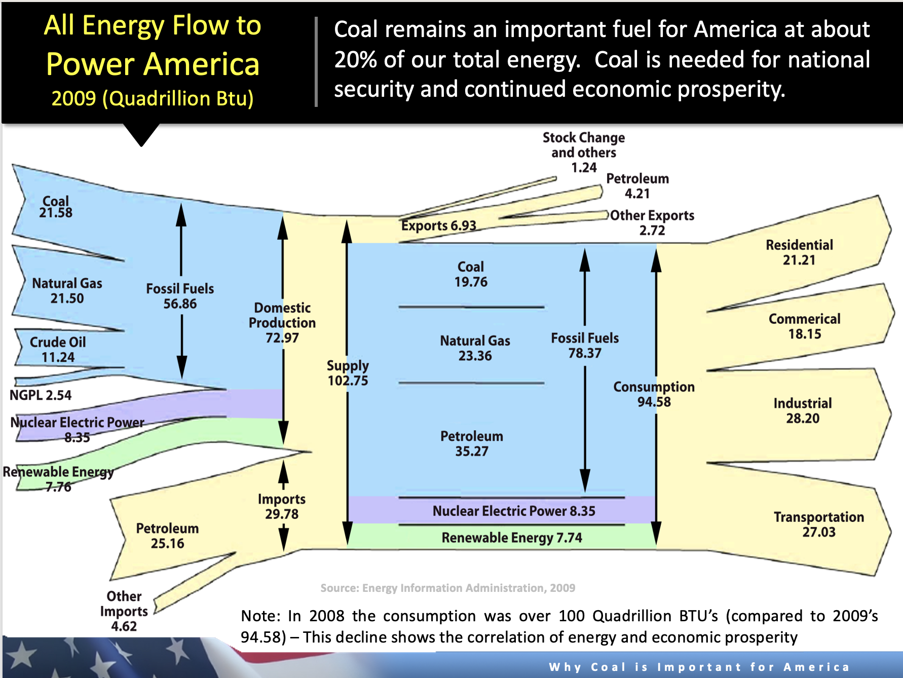 The total Primary Energy Flow chart shown below is from 2009. Back then, coal was the primary fuel for about 50% of America’s electricity generation. The U.S. used right at a Billion tons of coal/year and America’s Total Primary Energy Use was 102.75 Quadrillion Btus. The technology and Infrastructure remains to return to this coal generation capacity and to do it cleanly. We should be building new HELE Coal plants with future provisions for CCUS. This would be a Rational Energy Plan to embark on, (a transition plan) until new nuclear, hydrogen, storage and renewables technologies can advance to meet energy needs.