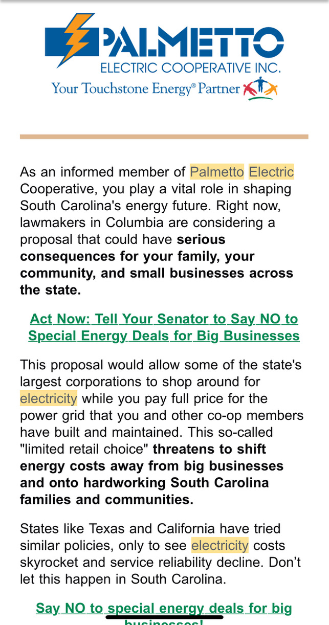 13. The decision to cancel the Pee Dee Coal Plant in 2009  and the failure of SCE&G to complete Units 2 & 3 at the Summer Nuclear Plant will result in increased electricity costs for all of Palmetto Electric customers: https://www.powermag.com/south-carolinas-santee-cooper-shelves-2-billion-coal-plant-project/